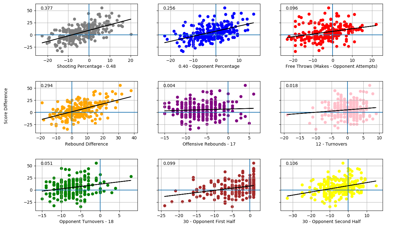 Below we can see each goal graphed separately. Each x-axis represents the goal difference, same as the input to the model above, and the y-axis represents the point differential for the game. Each graph has also been fitted with a regression line (some better than others) and its corresponding R^2 in the top left corner.